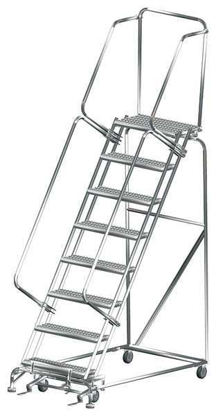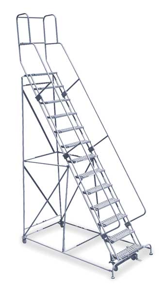 170 in H Steel Rolling Ladder, 13 StepsSKU G9863341Categories Material HandlingDescription Rolling Ladder, Material Steel, Platform Height 130 in, Handrails Included Yes, Handrail Height 42 in, Overall Height 170 in, Number of Steps 13, Unassembled, Load Capacity 450 lb, Step Tread Expanded Metal, Platform Depth 10 in, Platform Width 24 in, Bottom Width 42 in, Base Depth 95 in, Overall Width 42 in, Climbing Angle 59 Degrees , Step Depth 7 in, Step Width 24 in, Ladder Actuation Foot Activated Step Lock, Finish Powder Coated, Color Gray, Standards ANSI, OSHA, Includes Crutch TipsgraingerSKU: 5FYU1, mscSKU: , zoro_no: G9863341, mongo_id: 65bbe7183aaddbd5a9074a68