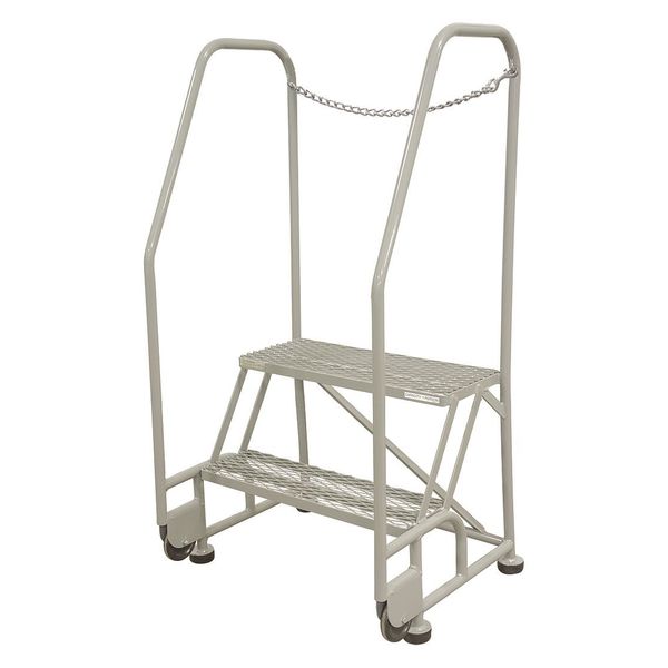 50 in H Steel Tilt and Roll Ladder, 2 StepsSKU G0999446Categories Material HandlingDescription Tilt and Roll Ladder, Material Steel, Platform Height 20 in, Handrails Included Yes, Handrail Height 30 in, Overall Height 50 in, Number of Steps 2, Assembled, Load Capacity 450 lb, Step Tread Expanded Metal, Platform Depth 10 in, Platform Width 16 in, Bottom Width 20 in, Base Depth 24 in, Overall Width 20 in, Climbing Angle 59 Degrees , Step Depth 7 in, Step Width 16 in, Ladder Actuation None, Finish Powder Coated, Color Gray, Standards ANSI, OSHA, Includes Removable Rear Chain, Rear Exit YesgraingerSKU: 21VA45, mscSKU: , zoro_no: G0999446, mongo_id: 65bbe7183aaddbd5a9074a5c
