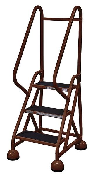 $677.49 / eachWeb price57 in H Steel Rolling Ladder, 3 StepsSKU G6253484Categories Material HandlingDescription Rolling Ladder, Material Steel, Platform Height 27 in, Handrails Included Yes, Handrail Height 30 in, Overall Height 57 in, Number of Steps 3, Unassembled, Load Capacity 450 lb, Step Tread Antislip Vinyl, Platform Depth 14 in, Platform Width 16 in, Bottom Width 24 in, Base Depth 32 in, Overall Width 24 in, Climbing Angle 59 Degrees , Step Depth 8 in, Step Width 16 in, Ladder Actuation Weight Activated Step Lock, Finish Powder Coated, Color Brown, Standards ANSI, OSHA, Includes Double HandrailsgraingerSKU: 6MXF3, mscSKU: , zoro_no: G6253484, mongo_id: 65bbe82a22d7a989a98dd568