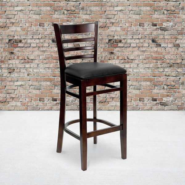 Ladder Back Walnut Wood Restaurant Barstool, Black Vinyl Seat, PK2