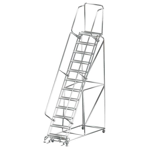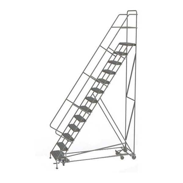 SKU G3489976Categories Material HandlingDescription Rolling Ladder, Material Steel, Platform Height 140 in, Handrails Included Yes, Handrail Height 42 in, Overall Height 182 in, Number of Steps 14, Unassembled, Load Capacity 450 lb, Step Tread Expanded Metal, Platform Depth 10 in, Platform Width 30 in, Bottom Width 42 in, Base Depth 198 in, Overall Width 44 in, Climbing Angle 59 Degrees , Step Depth 7 in, Step Width 30 in, Ladder Actuation Foot Activated Step Lock, Finish Powder Coated, Color Gray, Standards ANSI, OSHA, Rear Exit NograingerSKU: 21UZ21, mscSKU: , zoro_no: G3489976, mongo_id: 65bbe82a22d7a989a98dd551