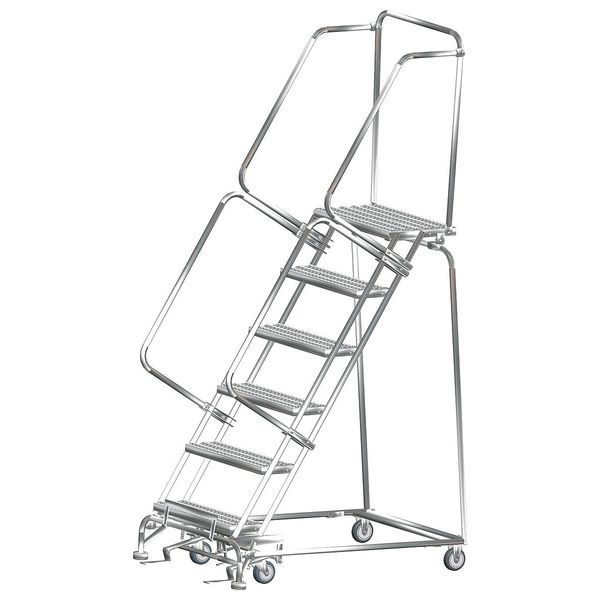 SKU G0997860Categories Material HandlingDescription Rolling Ladder, Material Steel, Platform Height 60 in, Handrails Included Yes, Handrail Height 30 in, Overall Height 90 in, Number of Steps 6, Assembled, Load Capacity 450 lb, Step Tread Perforated, Platform Depth 24 in, Platform Width 16 in, Bottom Width 24 in, Base Depth 72 in, Overall Width 24 in, Climbing Angle 50 Degrees , Step Depth 7 in, Step Width 16 in, Ladder Actuation Foot Activated Step Lock, Finish Powder Coated, Color Gray, Standards ANSI, OSHA, Rear Exit NograingerSKU: 21UV29, mscSKU: , zoro_no: G0997860, mongo_id: 65bbe82a22d7a989a98dd552