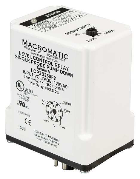 SKU G6013323Categories PumpsDescription Level Control Relay, Base Shape Octal, Contact Form SPDT, Current Rating 10 A, Electrical Connection 8-Pin Terminal, Flat Pin Width Not Applicable, Input Voltage 120V AC, Minimum Resistance Sensitivity 1,000 ohm, Maximum Resistance Sensitivity 250,000 ohm, Number of Pins 8, Number of Probes Single Probe, Relay Function Pump Up, Contact Rating (AC) 10 A @ 240V AC, Contact Rating (DC) 7 A @ 28V DC, Mounting Style Socket, Status Indicator LED Indicator, Body Depth 2.8 in, Body Height 3.2 ingraingerSKU: 31EL60, mscSKU: , zoro_no: G6013323, mongo_id: 65bbe94522d7a989a9944704