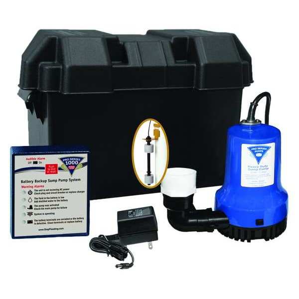 SKU G2633145Categories PumpsDescription Battery Backup Sump Pump, Pump Voltage 12V DC, Amps @ 10 Ft. of Head 6.5 A, Switch Actuation Dual Micro Reed, Flow Rate @ 10 Ft. of Head 16.6 gpm, Pump Body Material ABS, Alarm Output Audible, Visual, HP 1/4 hp, Charger Input Voltage 115V AC, Charger Output Voltage 12, Charger Hz 60, Required Battery Battery, Sold Separately, Max. Head 15 ft, Impeller Material Polycarbonate, Shaft Seal Material - Pumps Carbon, Ceramic, Rulon, On Point Adjustable, Off Point Adjustable, Min. Sump Pit Dia. 12 ingraingerSKU: 4NE46, mscSKU: , zoro_no: G2633145, mongo_id: 65bbe8a322d7a989a9907f65