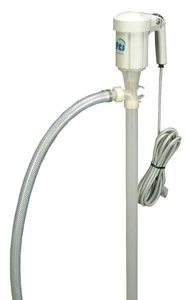 SKU G3393354Categories PumpsDescription Electric Operated Drum Pump, Hose Inside Dia. 3/4 in, Max. Head Pressure 8 psi, Max. Outlet Pressure 8 psi, For Use With Corrosive Chemicals, Sodium Hypochlorite-Chlorine Bleach, Rated Voltage 115V AC, Plug Type NEMA 5-15, Suction Tube OD 1 1/4 in, Hose Length 60 in, Suction Tube Length 40 in, Cord Length 12 ft, Includes Bung Adapter No, Runs Dry No, Thermal Protection No, Frequency (Hz) 60, Power Source Electric, Variable Speed Yes, Includes Discharge Hose Yes, Self-Priming YesgraingerSKU: 5FZU7, mscSKU: , zoro_no: G3393354, mongo_id: 65bbe6383aaddbd5a90152ac
