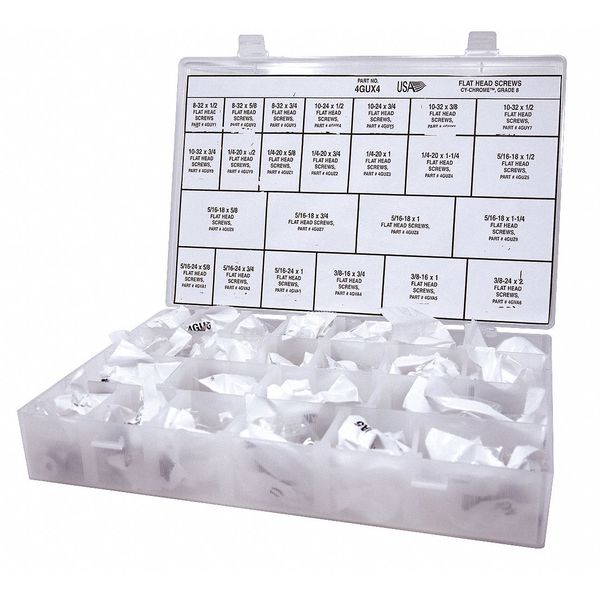 SKU G0298986Categories Raw MaterialsDescription Flat Head Screw Assortment, Socket Head Cap Screw Head Type Flat, Point Type Flat, Number of Pieces 120, System of Measurement Inch, Thread Size #10-24, #10-32, #8-32, 1/4 In.-20, 3/8 In.-16, 3/8 In.-24, 5/16 In.-18, 5/16 In.-24, Screw Size #8; #10; 1/4 in; 3/8 in; 5/16 in, Overall Length 3/8 in, 1/2 in, 5/8 in, 3/4 in, 1 in, 1 1/4 in, Number of Sizes 24, Drive Type Socket, Material Alloy Steel, Finish Chrome Plated, Thread Locking No, Pack Size Small Pack, Special Features Not Applicable$339.74 / eachWeb price