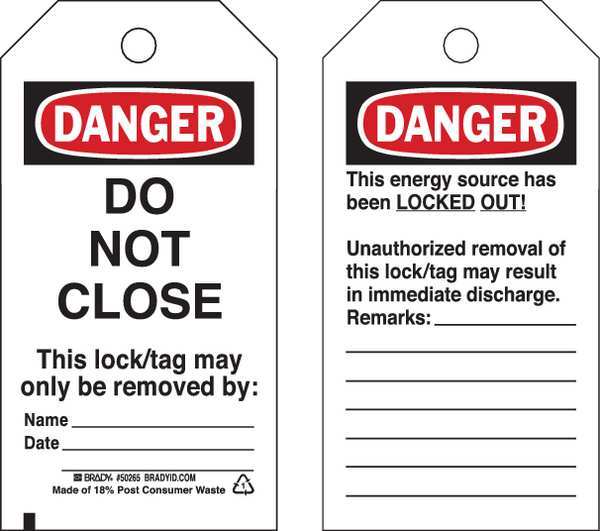 SKU G5524574Categories Raw MaterialsDescription Danger Tag, Front Side Legend Do Not Remove Tag, Header Danger, Language English, Legend Type Text, Mount Type Nylon Ties, Number of Printed Sides 2, Overall Height 5 3/4 in, Overall Width 3 in, Reverse Side Legend This Energy Source is Locked Out, Sign Background Color White, Sign Material Polyester, Sign Out Sections Remarks, Signage Type Tag, Write-On Surface Yes, For Location Outdoor, For Use With Lockout Tagout, Grommet Material Brass, Header Background Color Black/Red/WhitegraingerSKU: 20TJ19, mscSKU: , zoro_no: G5524574, mongo_id: 65bbe99922d7a989a996649c