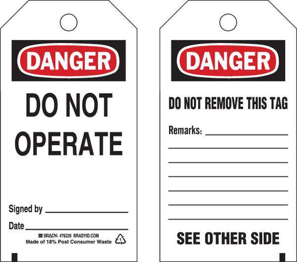 SKU G5797312Categories Raw MaterialsDescription Danger Tag, Front Side Legend Danger Do Not Operate, Header Danger, Language English, Legend Type Text, Mount Type Nylon Ties, Number of Printed Sides 2, Overall Height 5 3/4 in, Overall Width 3 in, Reverse Side Legend Do Not Remove Tag, Sign Background Color White, Sign Material Polyester, Sign Out Sections Date, Remarks, Signed By, Signage Type Tag, Write-On Surface Yes, For Location Outdoor, For Use With General Equipment, Grommet Material Metal, Header Background Color Black/Red/WhitegraingerSKU: 20TJ28, mscSKU: , zoro_no: G5797312, mongo_id: 65bbe9bf22d7a989a9974ac5