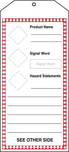 GHS Jumbo Tags, Prod Name, 8.5x3.875In, PK5SKU G8409414Categories Raw MaterialsDescription Tag, Color Black, Red, White, Fastener Attachment Length Not Applicable, Fastener Type Not Applicable, Hazard Communication Standard GHS, Height 8 1/2 in, Includes (5) Adhesive Vinyl Sheets, Indoor/Outdoor Usage Indoor/Outdoor, Lamination Type Not Laminated, Language English, Legend Same on Both Sides No, Mounting Hole Reinforcement Type No Reinforcement, Mounting Hole Size 3/8 in, Number of Printed Sides 2, Number of Tags 250, Preprinted Images (Reverse Side) Diamond Border, GHS SymbolgraingerSKU: 38W956, mscSKU: , zoro_no: G8409414, mongo_id: 65bbe7343aaddbd5a907f968