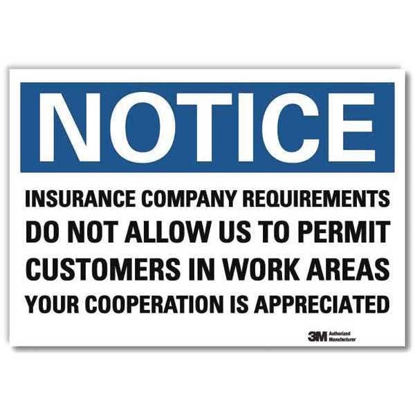 SKU G2761477Categories SafetyDescription Notice Sign, Vertical Rectangle, Number of Printed Sides 1, English, Sign Format Traditional OSHA, Sign Legend Insurance Company Requirements Do Not Allow Us To Permit Customers In Work Areas Your Cooperation Is Appreciated, Sign Legend Background Color White, Sign Legend Style TextgraingerSKU: 34JN93, mscSKU: , zoro_no: G2761477, mongo_id: 65bbe8339a749db82277b783