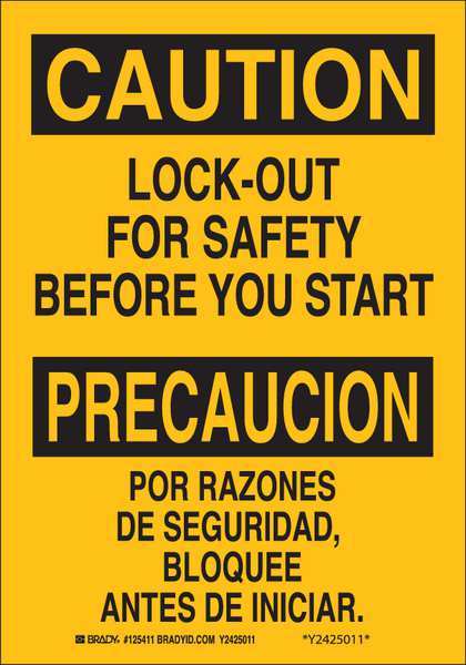 SKU G7368973Categories SafetyDescription Safety Sign, Sign Subject Matter Lockout Tagout, Height 10 in, Width 7 in, Sign Material Polyester, Header Caution/Precaucion, Legend Lock-Out For Safety Before You Start/Por Razones De Seguridad, Bloquee Antes De Iniciar, Printed Language English, Spanish, Sign Shape Rectangle$11.49 / eachWeb priceSafety Sign, 10 in Height, 7 in Width, Polyester, Rectangle, English, SpanishSKU G7368973Categories SafetyDescription Safety Sign, Sign Subject Matter Lockout Tagout, Height 10 in, Width 7 in, Sign Material Polyester, Header Caution/Precaucion, Legend Lock-Out For Safety Before You Start/Por Razones De Seguridad, Bloquee Antes De Iniciar, Printed Language English, Spanish, Sign Shape Rectangle$11.49 / eachWeb price -
