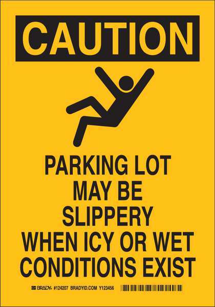 SKU G7386117Categories SafetyDescription Caution Sign, Sign Subject Matter Accident Prevention, Height 10 In., Width 7 In., Sign Material Polyester, Header Caution, Legend Parking Lot May Be Slippery When Icy Or Wet Conditions Exist, Printed Language English, Sign Shape Rectangle$16.24 / eachWeb priceCaution Sign, 10" H, 7" W, Polyester, Rectangle, English, 124207SKU G7386117Categories SafetyDescription Caution Sign, Sign Subject Matter Accident Prevention, Height 10 In., Width 7 In., Sign Material Polyester, Header Caution, Legend Parking Lot May Be Slippery When Icy Or Wet Conditions Exist, Printed Language English, Sign Shape Rectangle$16.24 / eachWeb price -