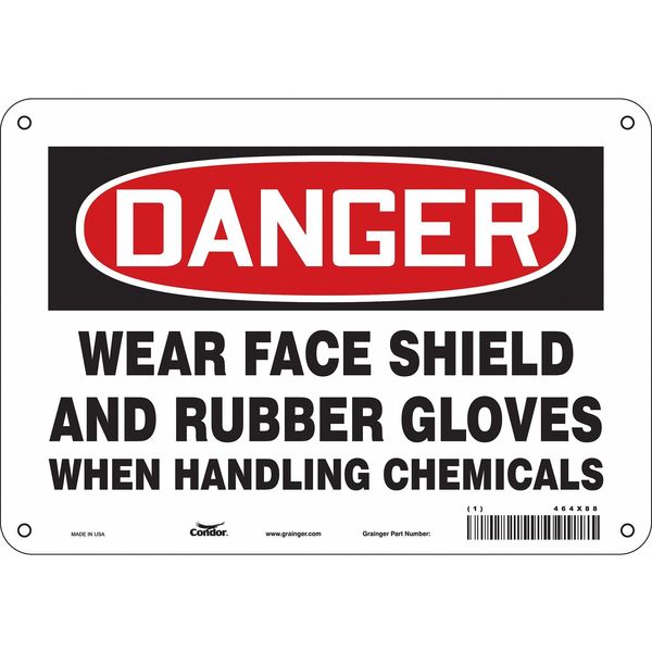Safety Sign, 7 in Height, 10 in Width, Aluminum, Vertical Rectangle, English, 464X88SKU G5861733Categories SafetyDescription Safety Sign, Vertical Rectangle, Number of Printed Sides 1, English, Sign Format Traditional OSHA, Sign Legend Wear Face Shield And Rubber Gloves When Handling Chemicals, Sign Legend Background Color White, Sign Legend Style TextgraingerSKU: 464X88, mscSKU: , zoro_no: G5861733, mongo_id: 65bbe91d22d7a989a9935854