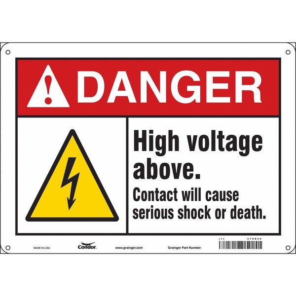 Safety Sign, 10 in Height, 14 in Width, Aluminum, Horizontal Rectangle, English, 479R59SKU G5882429Categories SafetyDescription Safety Sign, Horizontal Rectangle, Number of Printed Sides 1, English, Sign Format ANSI/OSHA Format, Sign Legend High Voltage Above. Contact Will Cause Serious Shock Or Death., Sign Legend Background Color White, Sign Legend Style Symbol and TextgraingerSKU: 479R59, mscSKU: , zoro_no: G5882429, mongo_id: 65bbe91d22d7a989a9935881