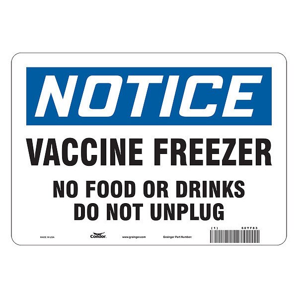 SKU G200461127Categories SafetyDescription Vaccine Freezer Sign, Height 7 in, Width 10 in, Sign Material Aluminum, Header Notice, Legend Vaccine Freezer No Food Or Drinks Do Not Unplug, Printed Language EnglishgraingerSKU: , mscSKU: , zoro_no: G200461127, mongo_id: 65bbe91d22d7a989a99358f3