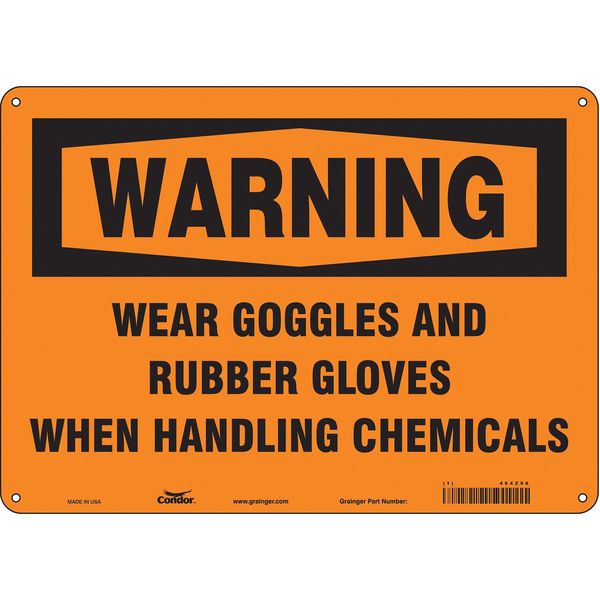 Safety Sign, 10 in Height, 14 in Width, Aluminum, Horizontal Rectangle, English, 464Z98SKU G5889182Categories SafetyDescription Safety Sign, Horizontal Rectangle, Number of Printed Sides 1, English, Sign Format Traditional OSHA, Sign Legend Wear Goggles And Rubber Gloves When Handling Chemicals, Sign Legend Background Color Orange, Sign Legend Style TextgraingerSKU: 464Z98, mscSKU: , zoro_no: G5889182, mongo_id: 65bbe91d22d7a989a993578c