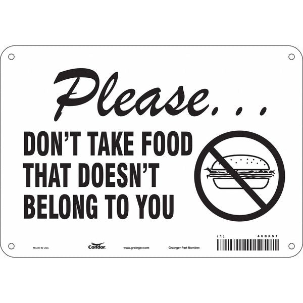 SKU G5199280Categories SafetyDescription Safety Sign, Vertical Rectangle, Number of Printed Sides 1, English, Sign Format Other Format, Sign Legend Please Don't Take Food That Doesn't Belong To You, Sign Legend Background Color White, Sign Legend Style Symbol and TextgraingerSKU: 468X51, mscSKU: , zoro_no: G5199280, mongo_id: 65bbe91d22d7a989a9935842