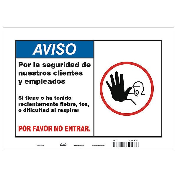 SKU G7661194Categories SafetyDescription Covid 19 Sign 10X14, Spanish Symptoms Do, Sign Subject Matter Coronavirus Prevention, Height 10 in, Width 14 in, Sign Material Polyester, Sign Mounting Style Adhesive Surface, Header Aviso, Legend Por La Seguridad De Nuestros Clientes Y Empleados; Si Tiene O Ha Tenido Recientemente Fiebre, Tos, O Dificultad De Respirar; Por Favor No Entrar., Printed Language SpanishgraingerSKU: , mscSKU: , zoro_no: G7661194, mongo_id: 65bbe91d22d7a989a9935829