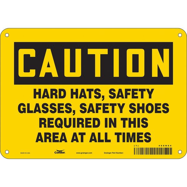 Safety Sign, 7 in Height, 10 in Width, Aluminum, Vertical Rectangle, English, 468N64SKU G5565222Categories SafetyDescription Safety Sign, Vertical Rectangle, Number of Printed Sides 1, English, Sign Format Traditional OSHA, Sign Legend Hard Hats, Safety Glasses, Safety Shoes Required In This Area At All Times, Sign Legend Background Color Yellow, Sign Legend Style TextgraingerSKU: 468N64, mscSKU: , zoro_no: G5565222, mongo_id: 65bbe91d22d7a989a99357bf