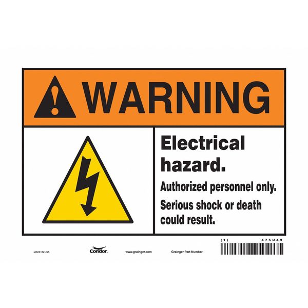 SKU G5868593Categories SafetyDescription Safety Sign, Vertical Rectangle, Number of Printed Sides 1, English, Sign Format ANSI/OSHA Format, Sign Legend Electrical Hazard. Authorized Personnel Only. Serious Shock Or Death Could Result., Sign Legend Background Color White, Sign Legend Style Symbol and TextgraingerSKU: 475U49, mscSKU: , zoro_no: G5868593, mongo_id: 65bbe91d22d7a989a99357ad