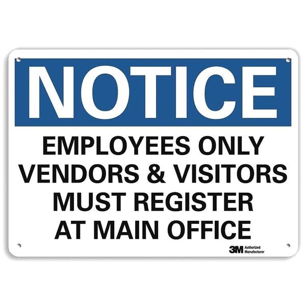SKU G2762910Categories SafetyDescription Notice Sign, Vertical Rectangle, Number of Printed Sides 1, English, Sign Legend Employees Only Vendors & Visitors Must Register At Main Office, Sign Legend Background Color White, Sign Legend Style TextgraingerSKU: 34JL89, mscSKU: , zoro_no: G2762910, mongo_id: 65bbe8339a749db82277b56e