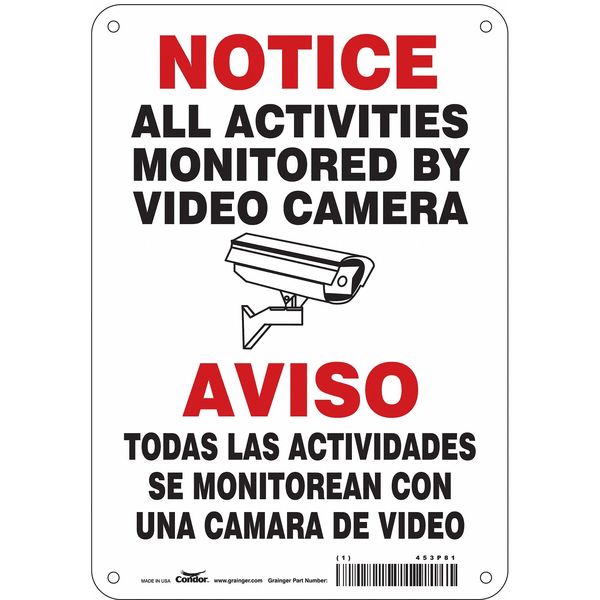 SKU G5100991Categories SafetyDescription Security Sign, Horizontal Rectangle, Number of Printed Sides 1, English, Sign Legend All Activities Monitored By Video Camera/Aviso Todas Las Actividades Se Monitorean Con Una Camara De Video, Sign Legend Background Color White, Sign Legend Style Symbol and TextgraingerSKU: 453P81, mscSKU: , zoro_no: G5100991, mongo_id: 65bbe8f722d7a989a9927640