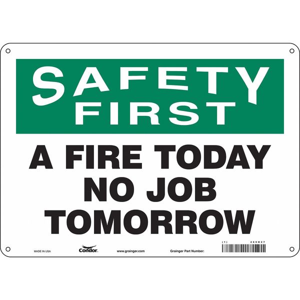 SKU G5635450Categories SafetyDescription Safety Sign, Horizontal Rectangle, Number of Printed Sides 1, English, Sign Format Traditional OSHA, Sign Legend A Fire Today No Job Tomorrow, Sign Legend Background Color White, Sign Legend Style TextgraingerSKU: 469H27, mscSKU: , zoro_no: G5635450, mongo_id: 65bbe8f722d7a989a99275f0