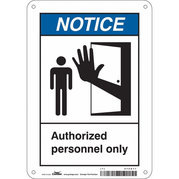 Safety Sign, 10 in Height, 7 in Width, Aluminum, Horizontal Rectangle, English, 472U11SKU G5887207Categories SafetyDescription Safety Sign, Horizontal Rectangle, Number of Printed Sides 1, English, Sign Format ANSI/OSHA Format, Sign Legend Authorized Personnel Only, Sign Legend Background Color White, Sign Legend Style Symbol and TextgraingerSKU: 472U11, mscSKU: , zoro_no: G5887207, mongo_id: 65bbe8f722d7a989a99275b9