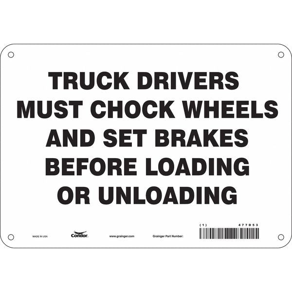 Safety Sign, 7 in Height, 10 in Width, Aluminum, Vertical Rectangle, English, 477D53SKU G5814833Categories SafetyDescription Safety Sign, Vertical Rectangle, Number of Printed Sides 1, English, Sign Format Other Format, Sign Legend Truck Drivers Must Chock Wheels And Set Brakes Before Loading Or Unloading, Sign Legend Background Color White, Sign Legend Style TextgraingerSKU: 477D53, mscSKU: , zoro_no: G5814833, mongo_id: 65bbe8f722d7a989a99275bb