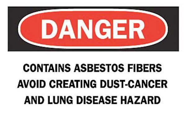 SKU G7437978Categories SafetyDescription Danger Sign, Sign Subject Matter Health Hazard, Height 7 in, Width 10 in, Sign Material Aluminum, Sign Mounting Style With Mounting Holes, Header Danger, Legend Contains Asbestos Fibers, May Cause Cancer, Causes Damage To Lungs, Do Not Breathe Dust, Avoid Creating Dust, Printed Language English, Sign Shape Rectangle$18.56 / eachWeb priceDanger Sign, 7 in H, 10 in W, Rectangle, English, 122458SKU G7437978Categories SafetyDescription Danger Sign, Sign Subject Matter Health Hazard, Height 7 in, Width 10 in, Sign Material Aluminum, Sign Mounting Style With Mounting Holes, Header Danger, Legend Contains Asbestos Fibers, May Cause Cancer, Causes Damage To Lungs, Do Not Breathe Dust, Avoid Creating Dust, Printed Language English, Sign Shape Rectangle$18.56 / eachWeb price -