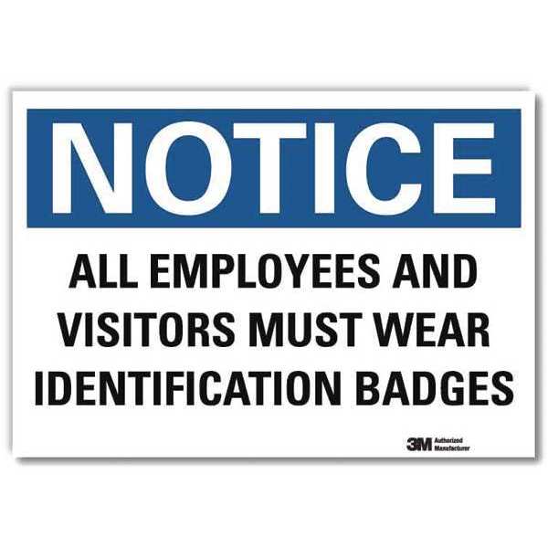 SKU G2765318Categories SafetyDescription Notice Sign, Horizontal Rectangle, Number of Printed Sides 1, English, Sign Format Traditional OSHA, Sign Legend All Employees And Visitors Must Wear Identification Badges, Sign Legend Background Color White, Sign Legend Style Text Notice Sign, 5 in H, 7 in W, Reflective Sheeting, Horizontal Rectangle, English, U5-1045-RD_7X5