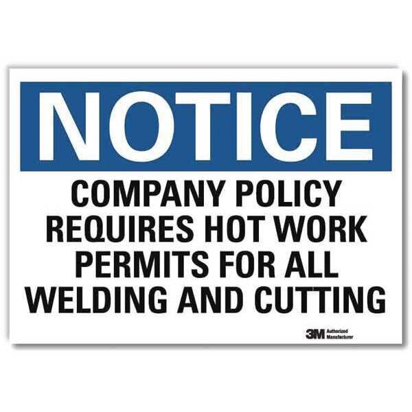 SKU G2764329Categories SafetyDescription Notice Sign, Horizontal Rectangle, Number of Printed Sides 1, English, Sign Format Traditional OSHA, Sign Legend Company Policy Requires Hot Work Permits For All Welding And Cutting, Sign Legend Background Color White, Sign Legend Style Text Notice Sign, 5 in H, 7 in W, Reflective Sheeting, Horizontal Rectangle, English, U5-1106-RD_7X5