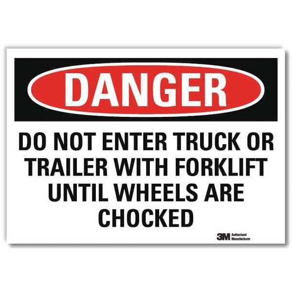 SKU G2749708Categories SafetyDescription Danger Sign, Horizontal Rectangle, Number of Printed Sides 1, English, Sign Format Traditional OSHA, Sign Legend Do Not Enter Truck Or Trailer With Forklift Until Wheels Are Chocked, Sign Legend Background Color White, Sign Legend Style Text Danger Sign, 5 in H, 7 in W, Reflective Sheeting, Horizontal Rectangle, English, U3-1322-RD_7X5
