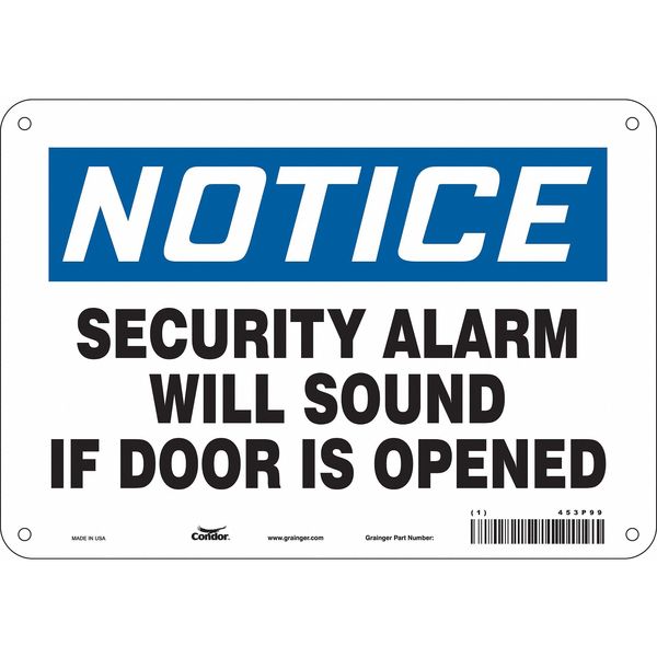 Security Sign, 7 in H, 10 in W, Aluminum, Vertical Rectangle, English, 453P99SKU G5896191Categories SafetyDescription Security Sign, Vertical Rectangle, Number of Printed Sides 1, English, Sign Format Traditional OSHA, Sign Legend Security Alarm Will Sound If Door Is Opened, Sign Legend Background Color White, Sign Legend Style TextgraingerSKU: 453P99, mscSKU: , zoro_no: G5896191, mongo_id: 65bbe8d122d7a989a9918f50