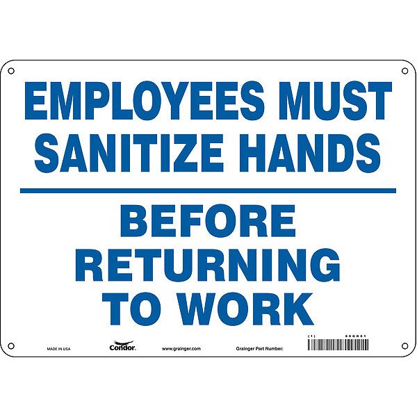 Safety Sign, 60GK61SKU G1629804Categories SafetyDescription Safety Sign, Height 10 in, Width 14 in, Sign Material Aluminum, Header No Header, Legend Employees Must Sanitize Hands Before Returning To Work, Printed Language EnglishgraingerSKU: , mscSKU: , zoro_no: G1629804, mongo_id: 65bbe8d122d7a989a9918d7e