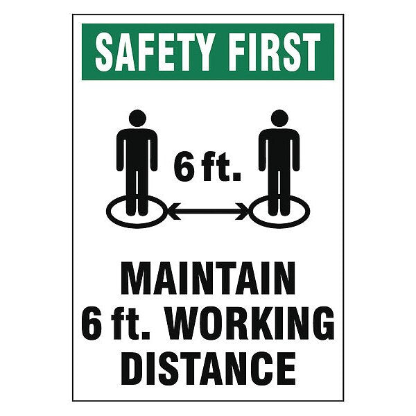 SKU G6697933Categories Adhesives, Epoxy & Sealants , SafetyDescription Adhesive Safety Sign, Sign Subject Matter Social Distancing, Height 10 in, Width 7 in, Sign Material Vinyl, Sign Mounting Style Adhesive Surface, Header Safety First, Legend Maintain 6 Ft. Working Distance, Printed Language EnglishgraingerSKU: , mscSKU: , zoro_no: G6697933, mongo_id: 65bbe96322d7a989a9951e3c