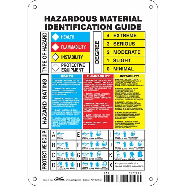 Safety Sign, 10 in Height, 7 in Width, Aluminum, Horizontal Rectangle, English, 476G32SKU G5869950Categories SafetyDescription Label, Adhesive Non-Adhesive, Adhesive Material Not Applicable, Adhesive Properties Non-Adhesive, Background Color Blue, Red, White, Yellow, Hazard Communication Standard ANSI/ NFPA, Height 10 in, Kit Contents Not Applicable, Lamination Type Laminated, Language English, Material Aluminum, Material Properties Rigid, Maximum Service Temperature 250 Degrees F, Minimum Service Temperature -40 Degrees F, Mounting Type Mounting Holes, Package Type Each, Preprinted Images HMCIS ChartgraingerSKU: 476G32, mscSKU: , zoro_no: G5869950, mongo_id: 65bbe6ee3aaddbd5a9062eb2