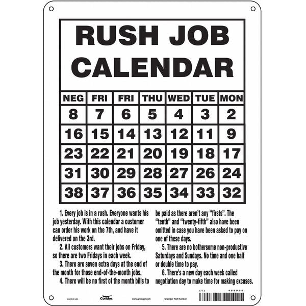 SKU G6274900Categories SafetyDescription Safety Sign, Vertical Rectangle, Number of Printed Sides 1, English, Sign Format Other Format, Sign Legend Rush Job Calendar 1. Every Job Is In A Rush. Everyone Want His Job Yesterday., Sign Legend Background Color White, Sign Legend Style Symbol and TextgraingerSKU: 486P08, mscSKU: , zoro_no: G6274900, mongo_id: 65bbe88122d7a989a98fc35c