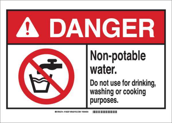 $29.99 / eachWeb priceDanger Sign, NonPotable Water, B-302, 10"H, 145207SKU G8638767Categories SafetyDescription Danger Sign, Sign Subject Matter Potable Water, Height 10 In., Width 14 In., Sign Material Polyester, Sign Mounting Style Adhesive Surface, Header Danger, Legend Non-Potable Water. Do Not Use For Drinking, Washing Or Cooking Purposes., Printed Language English, Sign Shape RectanglegraingerSKU: , mscSKU: , zoro_no: G8638767, mongo_id: 65bbe98822d7a989a99608fd