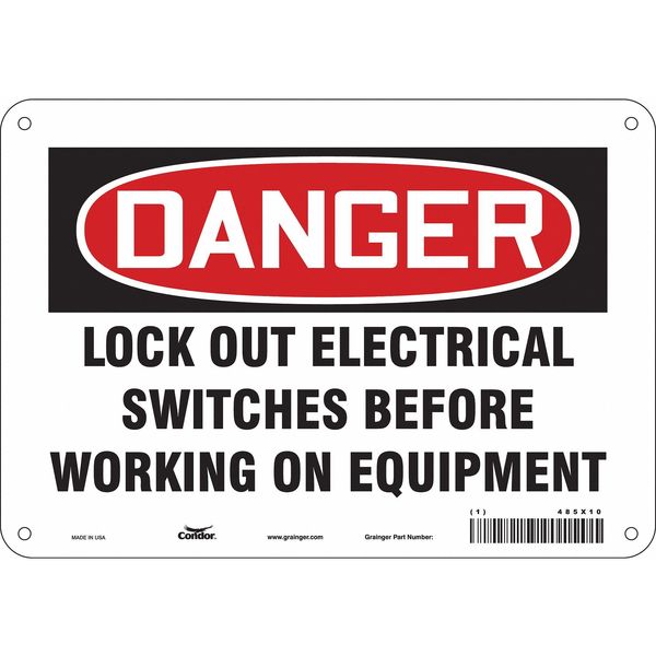 $18.74 / eachWeb priceSafety Sign, 7 in Height, 10 in Width, Aluminum, Vertical Rectangle, English, 485X10SKU G6318623Categories SafetyDescription Safety Sign, Vertical Rectangle, Number of Printed Sides 1, English, Sign Format Traditional OSHA, Sign Legend Lock Out Electrical Switches Before Working On Equipment, Sign Legend Background Color White, Sign Legend Style TextgraingerSKU: 485X10, mscSKU: , zoro_no: G6318623, mongo_id: 65bbe88a9a749db8227987d9