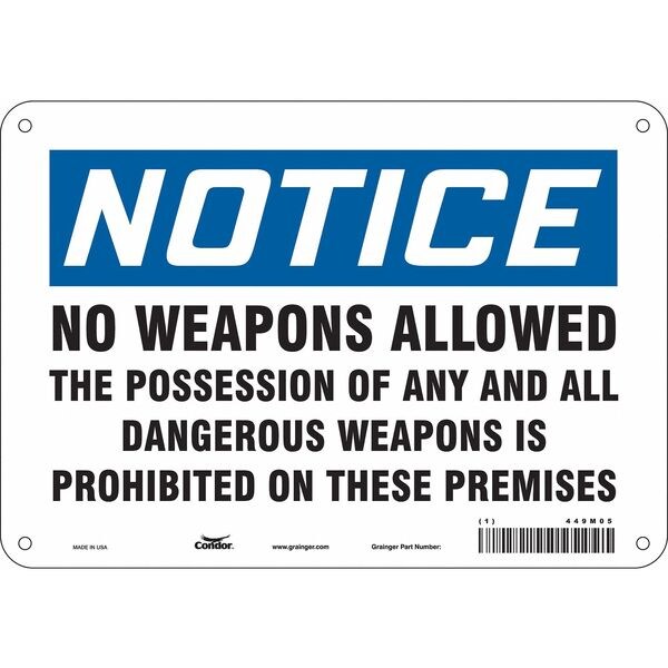 Safety Sign, 7 in Height, 10 in Width, Aluminum, Vertical Rectangle, English, 449M05SKU G5904978Categories SafetyDescription Safety Sign, Vertical Rectangle, Number of Printed Sides 1, English, Sign Legend No Weapons Allowed The Possession Of Any And All Dangerous Weapons Is Prohibited On These Premises, Sign Legend Background Color White, Sign Legend Style TextgraingerSKU: 449M05, mscSKU: , zoro_no: G5904978, mongo_id: 65bbe8ab22d7a989a990abb7