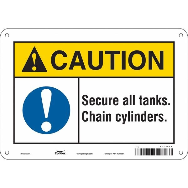 Safety Sign, 7 in Height, 10 in Width, Aluminum, Vertical Rectangle, English, 471P08SKU G5628338Categories SafetyDescription Safety Sign, Vertical Rectangle, Number of Printed Sides 1, English, Sign Format ANSI/OSHA Format, Sign Legend Secure All Tanks Chain Cylinders., Sign Legend Background Color White, Sign Legend Style Symbol and TextgraingerSKU: 471P08, mscSKU: , zoro_no: G5628338, mongo_id: 65bbe8ab22d7a989a990abd1