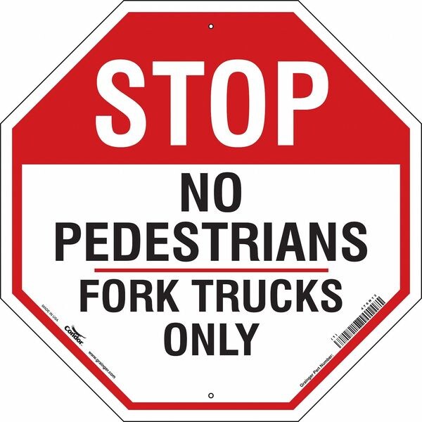Stop No Pedestrians Sign, 24" W, 24" H, English, Aluminum, Red, WhiteSKU G5814501Categories SafetyDescription Safety Sign, Octagon, Number of Printed Sides 1, English, Sign Format Other Format, Sign Legend Stop No Pedestrians Fork Trucks Only, Sign Legend Background Color Red, White, Sign Legend Style TextgraingerSKU: 476N13, mscSKU: , zoro_no: G5814501, mongo_id: 65bbe8ab22d7a989a990aa77