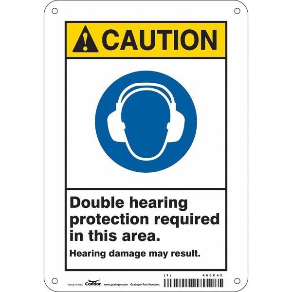 Safety Sign, 10 in Height, 7 in Width, Aluminum, Horizontal Rectangle, English, 466C42SKU G5894283Categories SafetyDescription Safety Sign, Horizontal Rectangle, Number of Printed Sides 1, English, Sign Format ANSI/OSHA Format, Sign Legend Double Hearing Protection Required In This Area. Hearing Damage May Result., Sign Legend Background Color White, Sign Legend Style Symbol and TextgraingerSKU: 466C42, mscSKU: , zoro_no: G5894283, mongo_id: 65bbe8ab22d7a989a990ab46