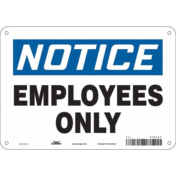 SKU G5059481Categories SafetyDescription Safety Sign, Vertical Rectangle, Number of Printed Sides 1, English, Sign Format Traditional OSHA, Sign Legend Employees Only, Sign Legend Background Color White, Sign Legend Style TextgraingerSKU: 472F47, mscSKU: , zoro_no: G5059481, mongo_id: 65bbe8ab22d7a989a990aa7a