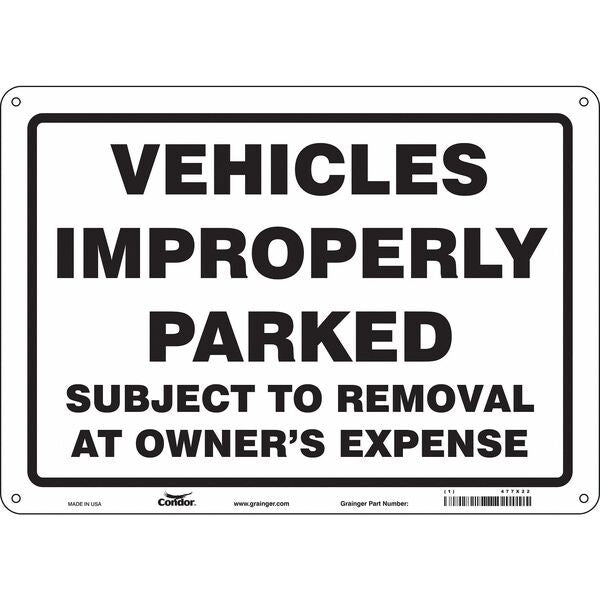 Improperly Parked Vehicles Sign, 10"x14, 477X22SKU G5892043Categories SafetyDescription Improperly Parked Vehicles Will Be Towed Parking Sign, Height 10 in, Width 14 in, Sign Material Aluminum, Sign Mounting Style Mounting Holes, Printed Language English, Sign Shape Horizontal RectanglegraingerSKU: 477X22, mscSKU: , zoro_no: G5892043, mongo_id: 65bbe8ab22d7a989a990a966