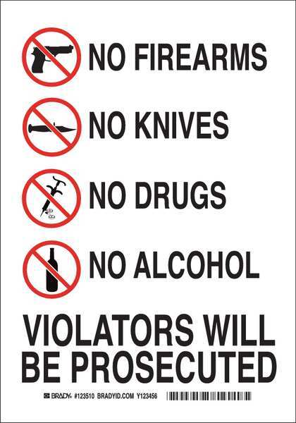 SKU G7377811Categories SafetyDescription Admittance Sign, Sign Subject Matter Weapons, Devices or Substances, Height 14 in, Width 10 in, Sign Material Plastic, Sign Mounting Style With Mounting Holes, Header No Header, Legend No Firearms No Knives No Drugs No Alcohol Violators Will Be Prosecuted, Printed Language English, Sign Shape Rectangle$17.49 / eachWeb priceAdmittance Sign, 14 in Height, 10 in Width, Plastic, Rectangle, EnglishSKU G7377811Categories SafetyDescription Admittance Sign, Sign Subject Matter Weapons, Devices or Substances, Height 14 in, Width 10 in, Sign Material Plastic, Sign Mounting Style With Mounting Holes, Header No Header, Legend No Firearms No Knives No Drugs No Alcohol Violators Will Be Prosecuted, Printed Language English, Sign Shape Rectangle$17.49 / eachWeb price -