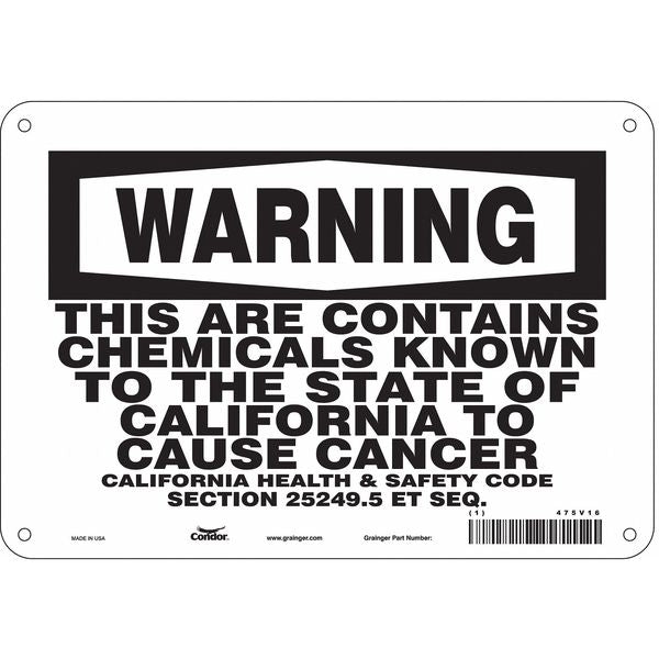 SKU G5774647Categories SafetyDescription Safety Sign, THIS AREA CONTAINS CHEMICALS KNOWN TO THE STATE OF CALIFORNIA TO CAUSE CANCER CALIFORNIA HEALTH & SAFETY CODE SECTION 25249.5 ET SEQ., Aluminum, Height 7 in, Width 10 in, Header No Header, Legend Style Text, Thickness 0.032 in, Sign Shape Rectangle, Operating Temp. Range -40 Degrees to 140 Degrees F, Retroreflective Grade Not RetroreflectivegraingerSKU: 475V16, mscSKU: , zoro_no: G5774647, mongo_id: 65bbe7113aaddbd5a907141f