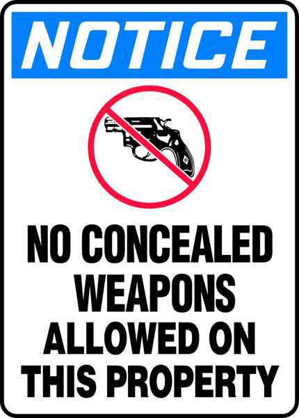 $9.44 / eachWeb priceNotice Sign, 10 in Height, 7 in Width, Plastic, Rectangle, EnglishSKU G1714869Categories SafetyDescription Notice Sign, Sign Subject Matter Weapons, Devices or Substances, Height 10 in, Width 7 in, Sign Material Plastic, Sign Mounting Style With Mounting Holes, Header Notice, Legend No Concealed Weapons Allowed On This Property, Printed Language English, Sign Shape RectanglegraingerSKU: , mscSKU: , zoro_no: G1714869, mongo_id: 65bbe94522d7a989a9944258