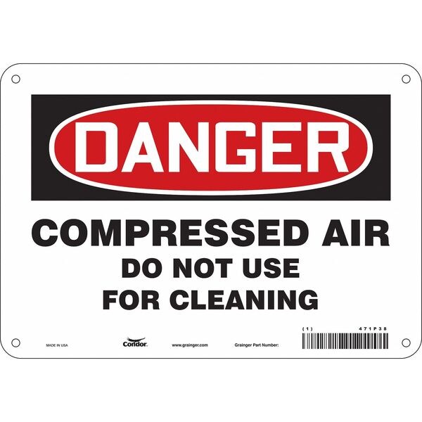 Safety Sign, 7 in Height, 10 in Width, Aluminum, Vertical Rectangle, English, 471P38SKU G5561287Categories SafetyDescription Safety Sign, Vertical Rectangle, Number of Printed Sides 1, English, Sign Format Traditional OSHA, Sign Legend Compressed Air Do Not Use For Cleaning, Sign Legend Background Color White, Sign Legend Style TextgraingerSKU: 471P38, mscSKU: , zoro_no: G5561287, mongo_id: 65bbe6753aaddbd5a902f65b
